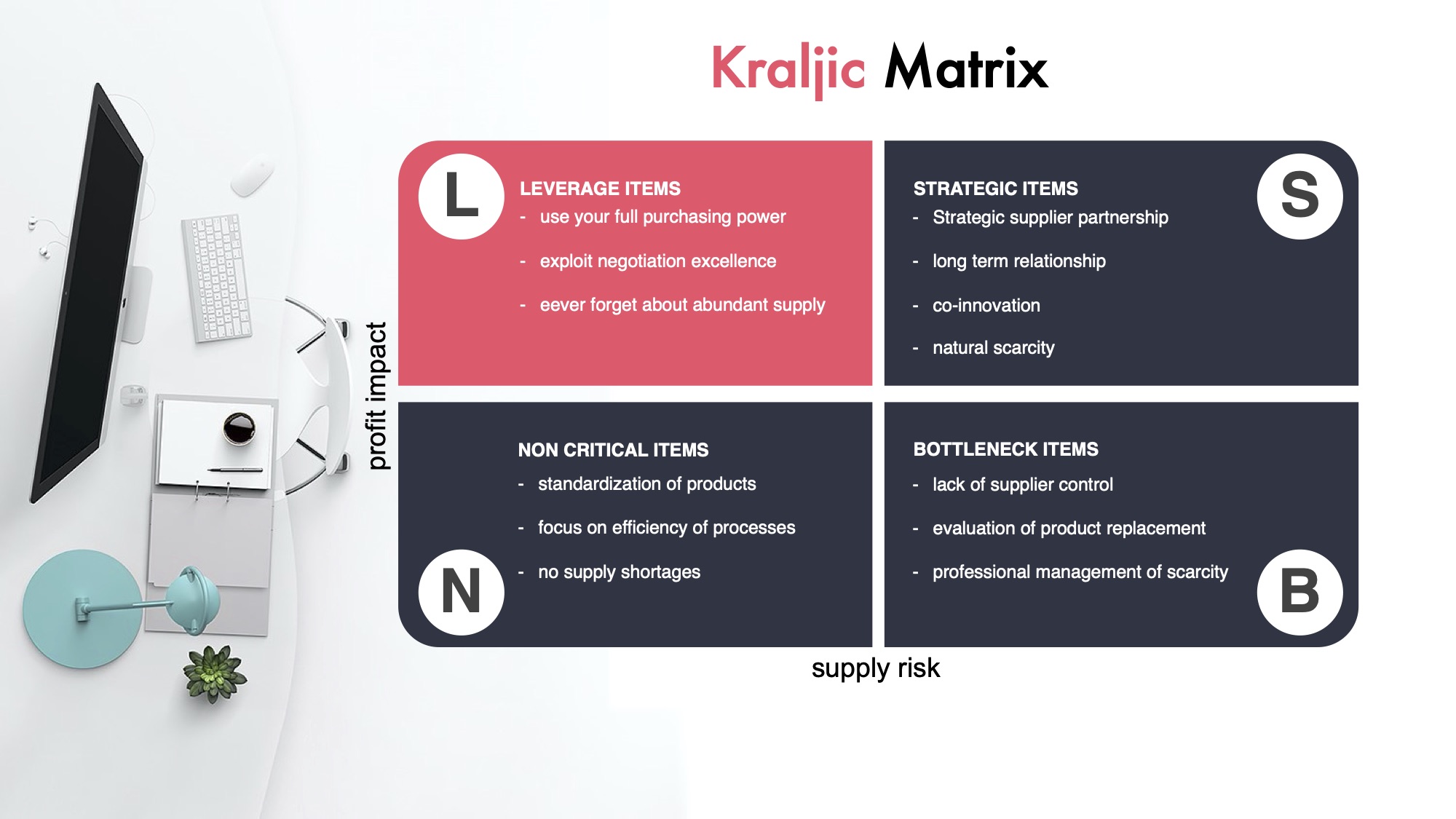 1999-ben az ebid-to-pay társalapítójának, Eberhard Austnak lehetőséget kapott, hogy Peter Kraljic beszerzési projektjének megbízott vezetőjeként dolgozzon Szlovéniában. A szellemes és rendkívül okos Peter Kraljic által inspirálva azt javasoljuk, hogy alkalmazza a Kraljic-mátrixot a kiadásai áttekintésére, mielőtt még költségmegtakarításon gondolkodna. Ha van ideje, érdemes elolvasni a Havard Business Review 1983. szeptemberi, "Purchasing Must Become Supply Management" című eredeti cikkét, hogy megismerje Peter Kraljic forradalmi megközelítésének minden finom részletét arról, hogyan lehet valóban kiválóvá válni a beszerzésben.