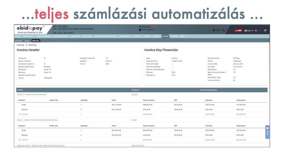 Lépjen kapcsolatba velünk a "Könyv bemutató" menüponton keresztül egy webes bemutatóért, vagy kérje közvetlenül a "Ingyenes teszt!" menüponton keresztül az ingyenes próbalicencet. Azonnal létrehozzuk Önnek saját tesztkörnyezetét, amelyet 6 héten keresztül ingyenesen használhat ajánlatkérésekhez, aukciókhoz stb.