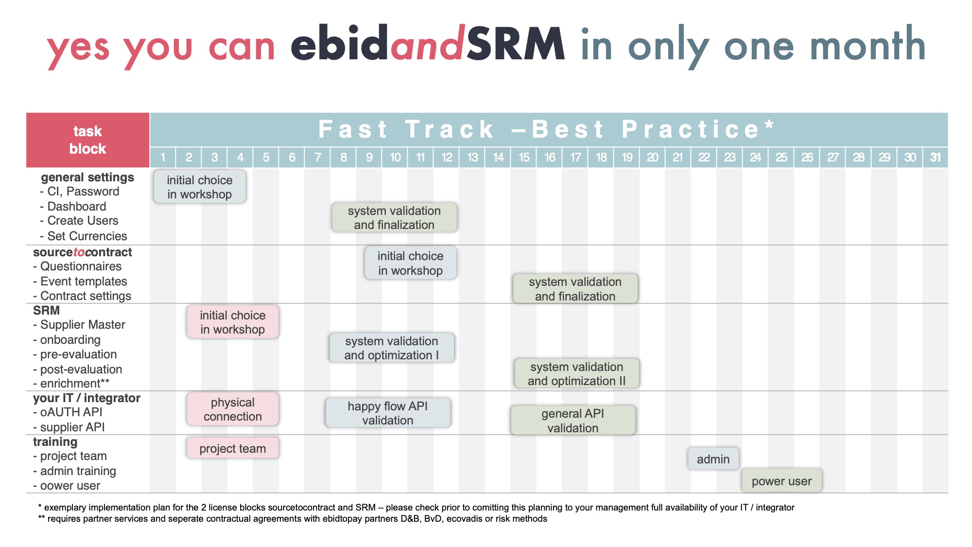 - Az ebid-to-pay támogatja a gyorsított bevezetést. Egy bevezetési workshop alkalmával egyszerűen kiválaszthatja a rendelkezésre álló legjobb gyakorlatnak megfelelő ajánlatkérési/aukciós sablonokat, kategóriafákat, beszállítói értékelési KPI-ket és KPI-kérdőíveket, beszállítói katalógusokat. Ezután