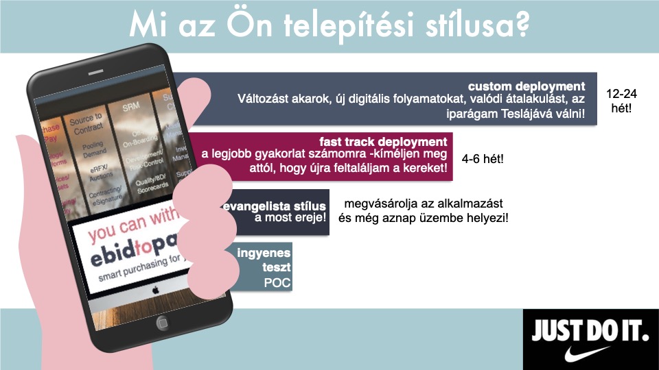- Az ebid-to-pay egyedi, teljesen rugalmas megközelítéssel is bevezethető, amelyet az integrátor vagy az Ön üzleti igényei alapján tervez meg (pl. bevezetési megbízás). Ezzel a projektmódszerrel a telepítés is sokkal gyorsabb lesz, mint a hagyományos sourcetopay-csomagok esetében.